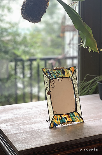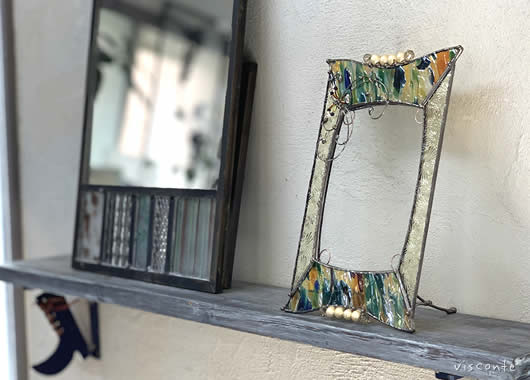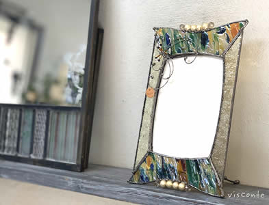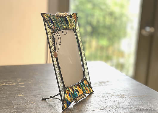 フリモントのガラスが鮮やかな個性のあるたて型フレームです。 パール使いやワイヤーを使った女性好みのフォトフレームです。