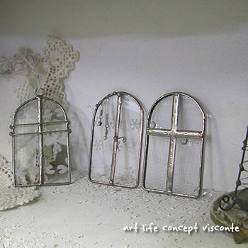 キットの中の2枚のガラスにはビスコンテでデザインしたイラストを彫り込んだサンドブラストガラスを使用していています。 お好みで吊り下げも可能なフックも3つ入っています。