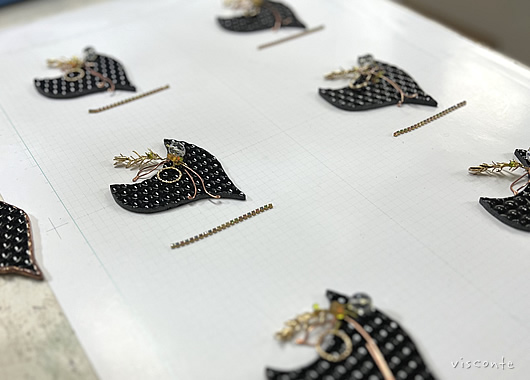 作りはじめた長いトレー。 5mm幅でカットしてみたり.. のせてビーズで留めてみました。 気に入ってます♪ 新作!という程ではないけど 新作!と呼びます