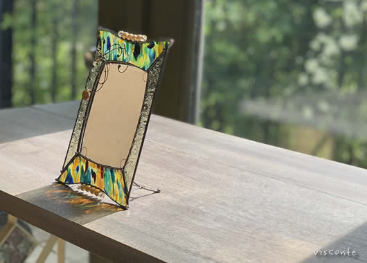 フリモントのガラスが鮮やかな個性のあるたて型フレームです。 パール使いやワイヤーを使った女性好みのフォトフレームです。